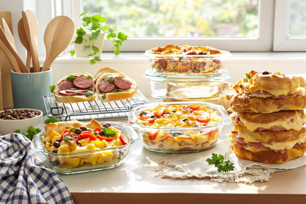 Pour ne pas dépasser l’heure de préparation, lancez plusieurs tâches en parallèle : pendant que le gratin est au four, vous pouvez mélanger le cake et monter les sandwiches. Une fois tous les plats refroidis, emballez-les bien pour les conserver au frais jusqu’à 4 jours.