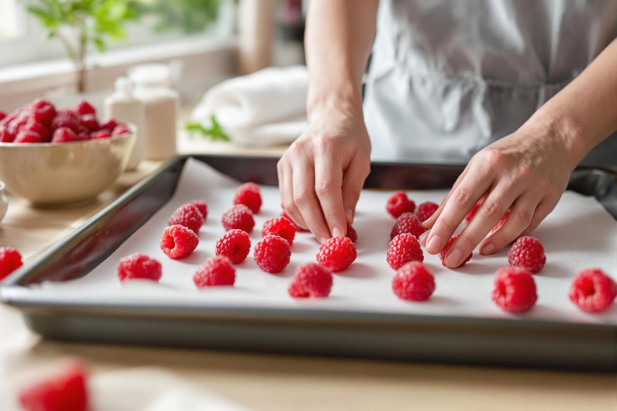 Alors voilà comment faire : prends une plaque (type four), pose un papier cuisson dessus, puis étale tes framboises sans qu’elles se touchent. Oui, ça prend un peu de place, mais crois-moi, ça vaut le coup.